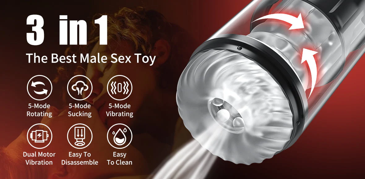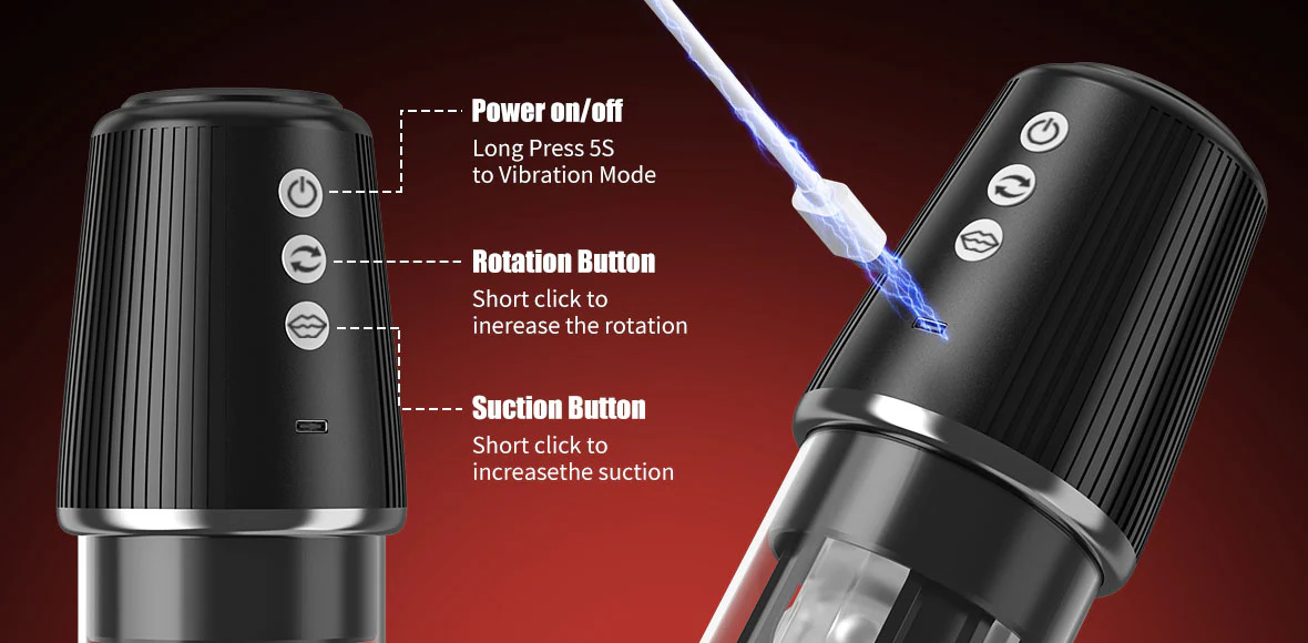 Multi-Dimensional Pleasure: Dive into a sea of ecstasy with 5 rotating, 5 sucking, and 7 vibrating modes. Whether you crave a singular sensation or a symphony of stimulation, this masturbation cup adapts to your desires, offering a spectrum of pleasure experiences. Dual-Purpose Design: Elevate your solo play and training sessions with powerful suction capabilities. This 2-in-1 marvel not only delivers intense pleasure but also aids in enhancing endurance, blending enjoyment with performance improvement. Triple Motor Power: Equipped with an N20 vibration motor, a 370 air pump, and a dedicated rotation motor, our device guarantees stability and strength in function. Experience the relentless power and precision that takes your pleasure to new peaks. Luxurious Silicone Sleeve: Immerse yourself in the indulgence of a silicone inner sleeve featuring a 0.98-inch thick entrance and 3-tiered texture for a massage that feels as real as it gets. The soft, comfortable embrace of our device offers an authentic experience designed to satisfy. Visual Excitement: Catering to your voyeuristic desires, the transparent cup allows you to witness the action. With three easy-to-use buttons, control is at your fingertips, making it effortless to navigate through modes and find your perfect setting.?