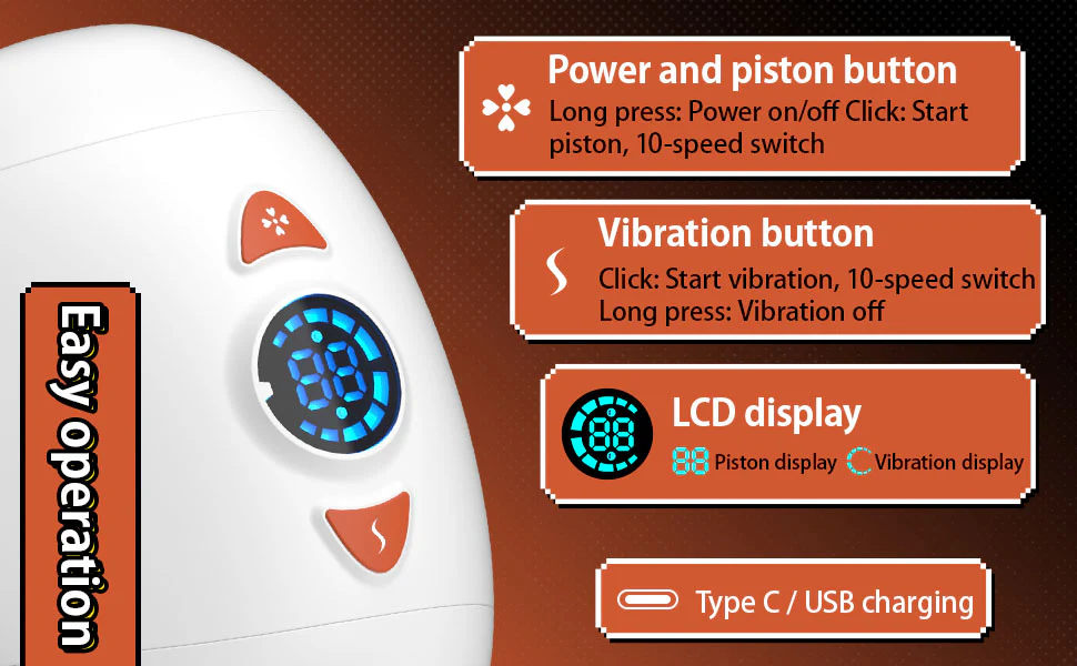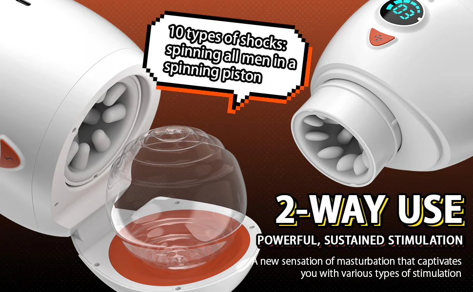 - 10-speed piston thrusting with synchronized vibrations for powerful release.